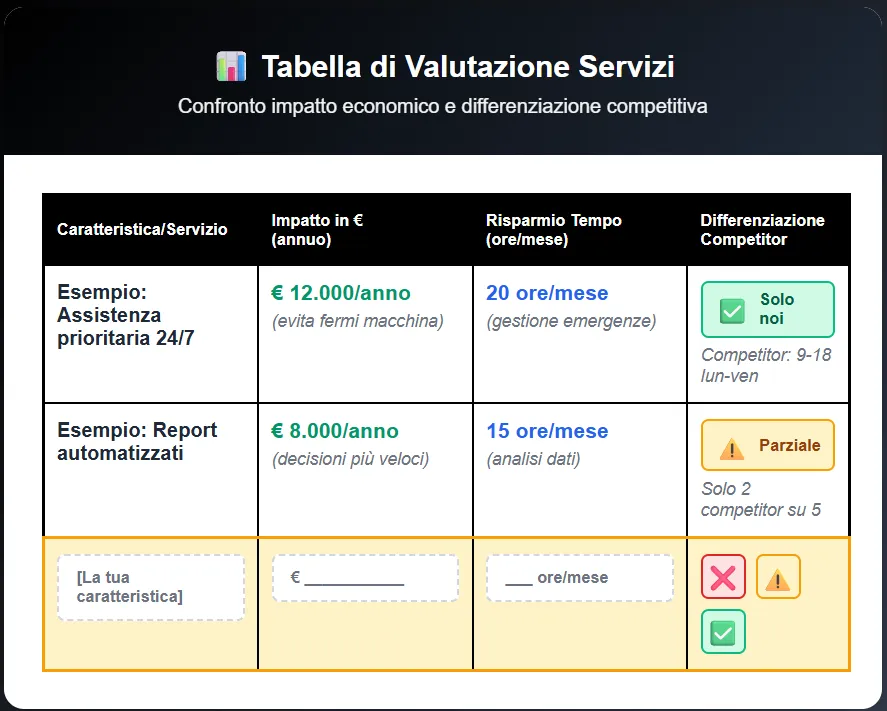 Usando la matrice del valore, quantificate in euro e ore risparmiate cosa offrite. Trasformatelo in una proposta che parli di risultati, non di caratteristiche. "Vi faremo risparmiare 40.000€ all'anno in costi operativi" batte sempre "Il nostro software ha 47 funzionalità".